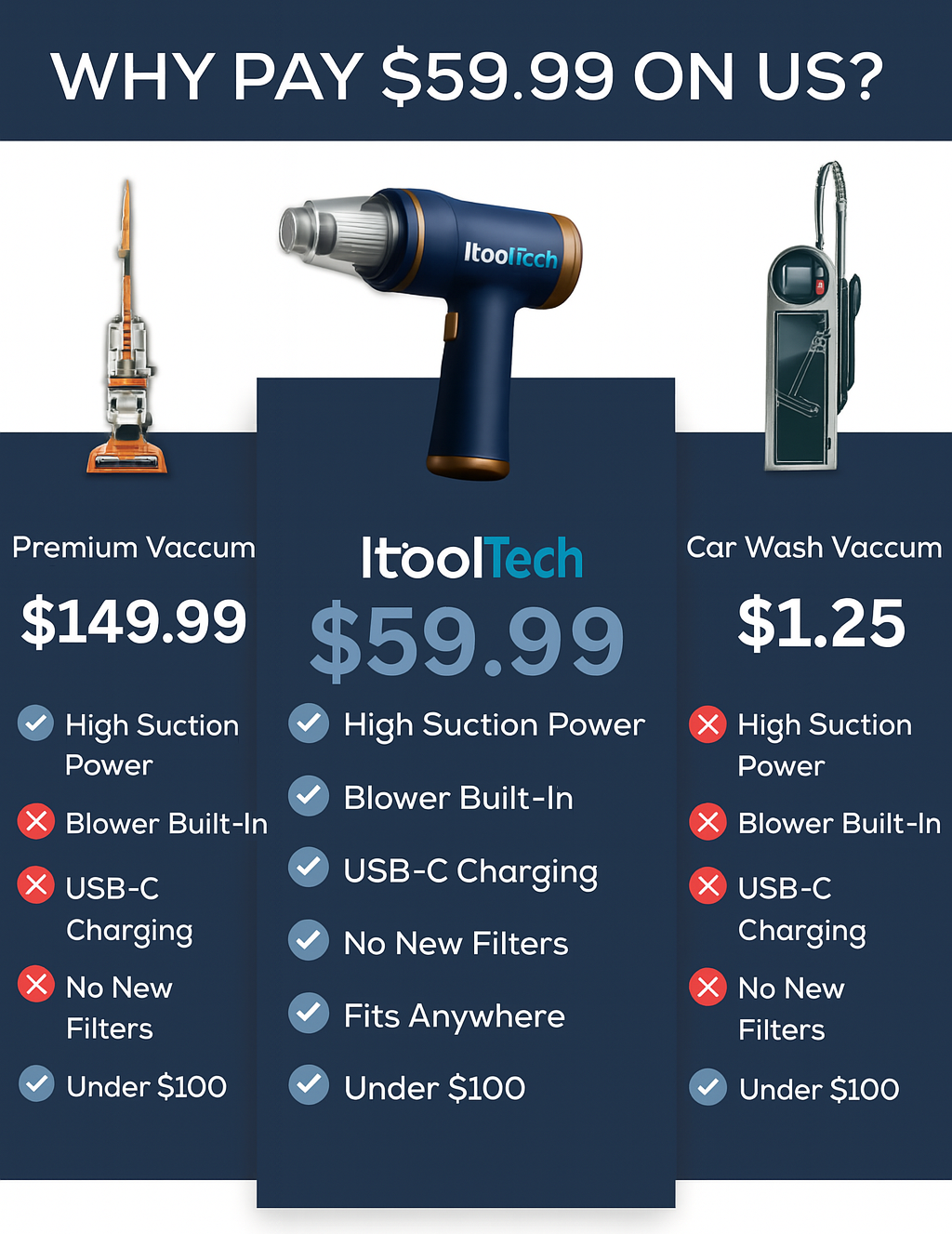 Don’t let the size fool you — ItoolTech delivers serious suction for every mess. From pet hair to crumbs and tight spaces, it’s the compact solution that cleans like a pro.